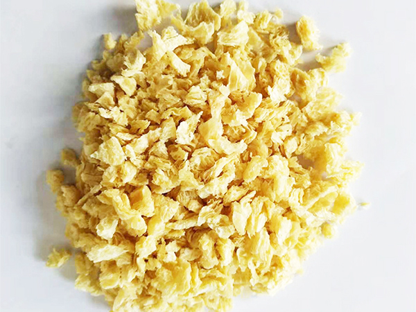 組織蛋白有粒狀、塊狀、片狀、絲狀等不同形態(tài),呈不同深淺的黃褐色,其網(wǎng)狀結(jié)構(gòu)成定向排列,形成具彈性、韌性的纖維束或積層,使在食用時有類似肉食肌肉組織的咬勁。典型的組織蛋白含蛋白質(zhì)60%左右??捎米鞣氯庵破返募±w維材料。
